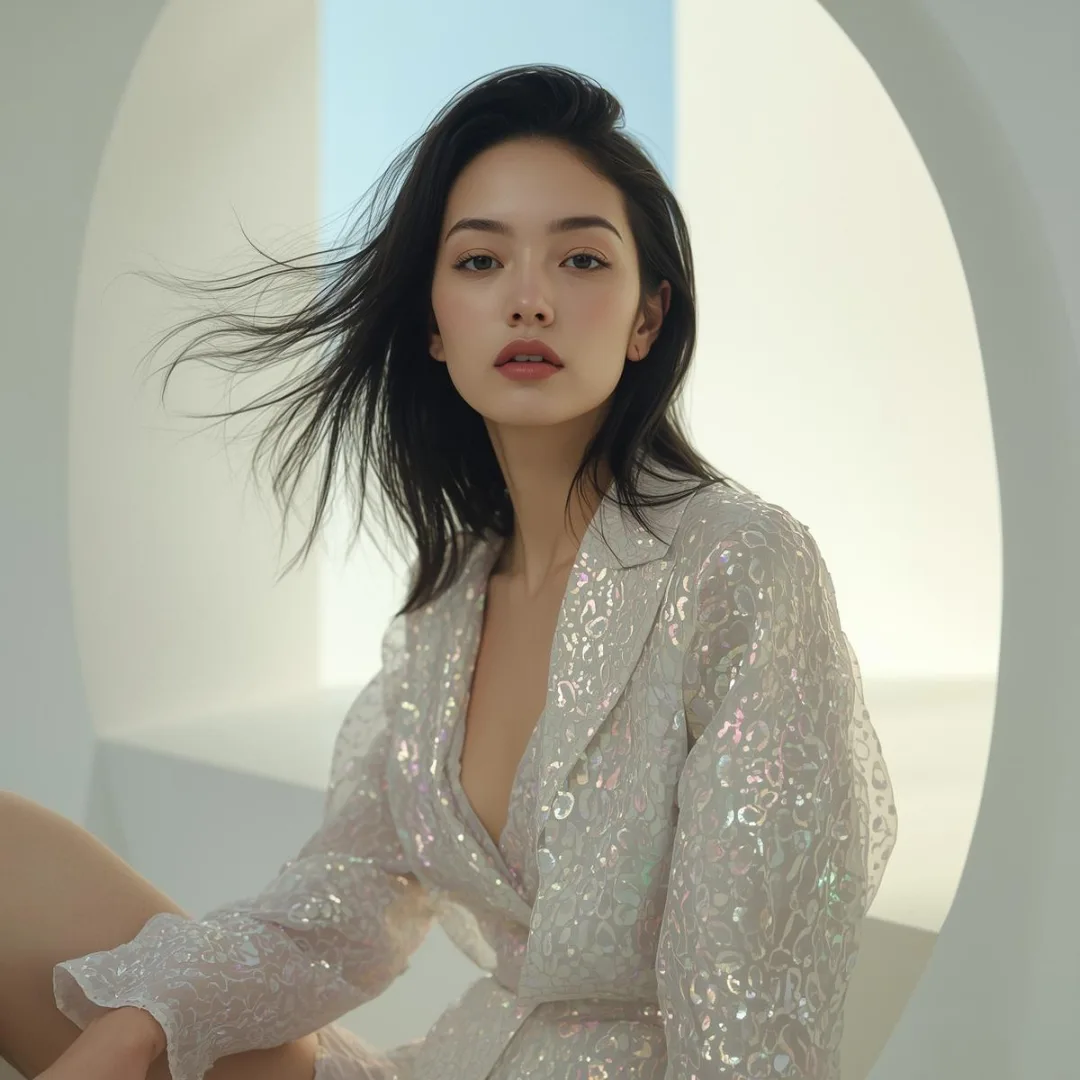 An editorial Fashion Lookbook inspired by Architectural Mermaidcore, conceptual styling and Mermaidcore outfits in Aquatic palette: blue, transformative teal, and lilac, captured at sunset by the sea ...